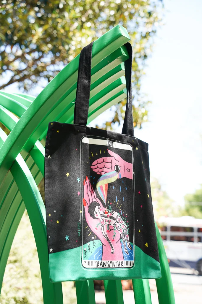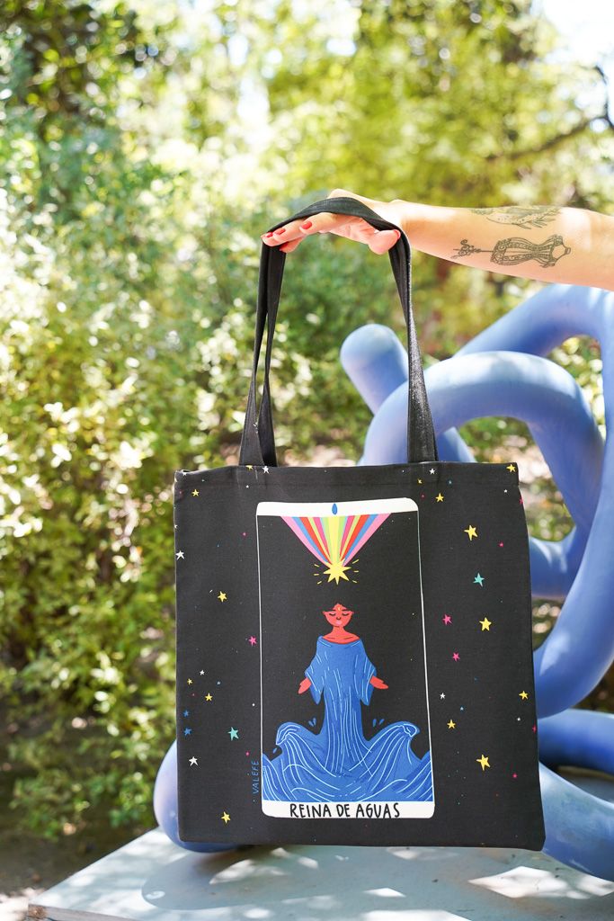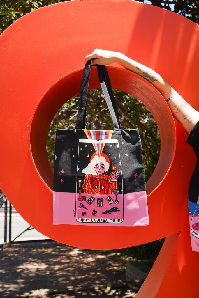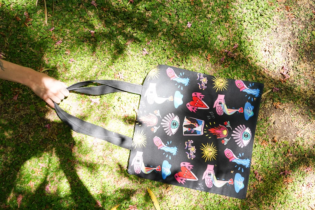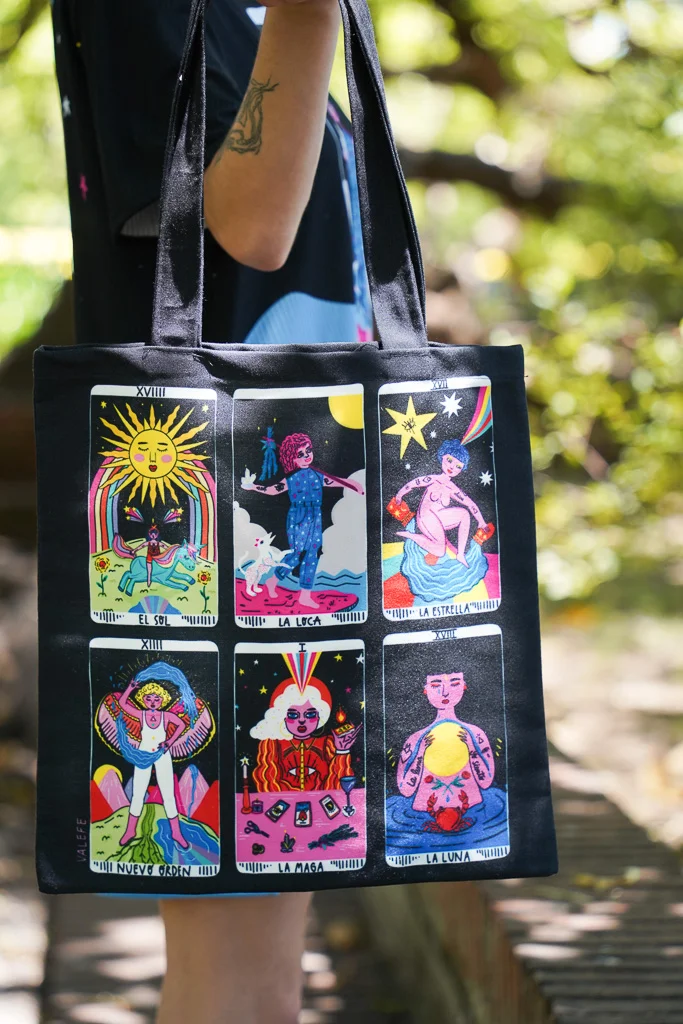 Tote Bag confeccionada en tela de tapicería e ilustrada en ambos lados por Vale Fe.